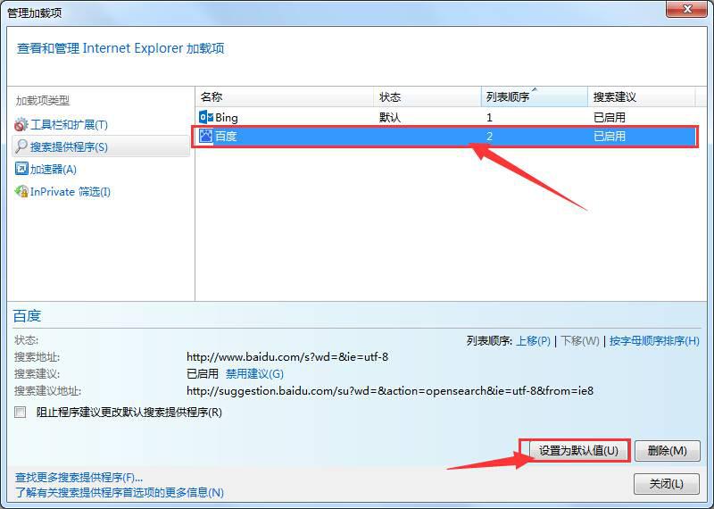 2、在打开的”管理加载项“,选择百度或是其它自己喜欢的,点击“设置为默认值(U)”。