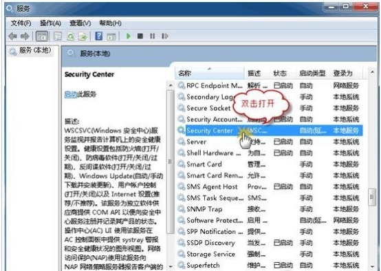 2.在打开的服务选项中找到并双击打开 Security Center 服务。