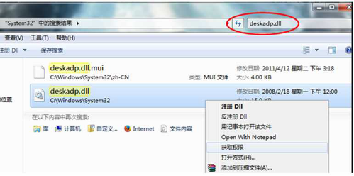 2、在计算机的“C:\Windows\System32”目录文件夹中,一一搜索分别为“deskadp.dll”、“deskmon.dll”、“deskperf.dll”名称3个文件,搜索出来后,逐一右击点选"获取权限"选项。