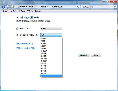 6、设置“使计算机进入睡眠状态”的时间,用户可按照自己的需求进行设置,也就是说隔多久没进行操作电脑的时候,屏幕就会进入睡眠状态。完成后点击“保存修改”就大功告成了。
