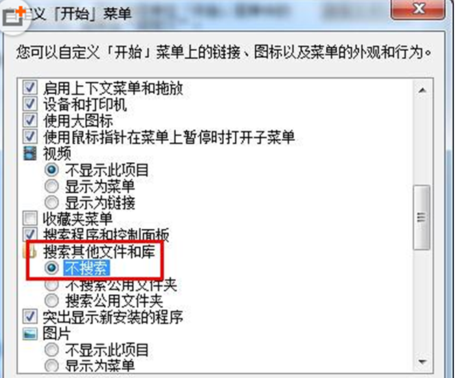 3、在弹出的“自定义‘开始’菜单”窗口中,拖动滑动条找到“搜索其他文件和库”选项,点选“不搜索”选项。