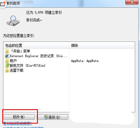 5、此时就可看到默认Windows索引了“开始”菜单、IE历史记录、用户文件夹和脱机文件,然后点击“修改”按钮可以进行自定义设置。