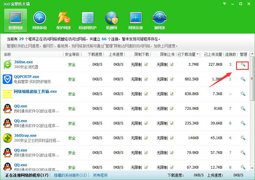 4、直接点击对应软件后面的扳手图标管理,便可对上传/下载流量进行设置。