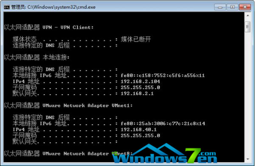 1、在雨林木风win7旗舰版系统中,点击任务栏左下角的“开始”——“运行”,键入“cmd”,单击“确定”,在打开的命令提示符窗口光标处输入“ipconfig”,按下“回车”键,查看IP地址是否正确。