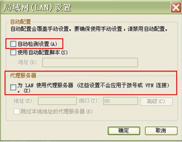 2、在“代理服务器”栏中取消选中其中的复选框,并确认设置。