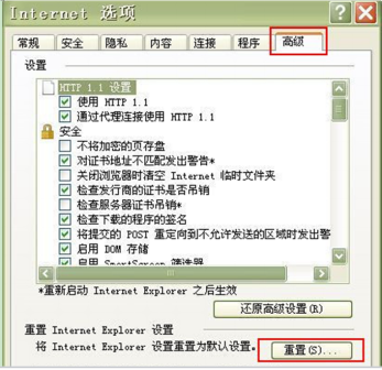 1、在打开的Internet选项中,切换到“高级”标签页,单击“重置”按钮,单击“确定”按钮。