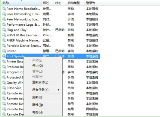 3、右键print spooler,选择重新启动。