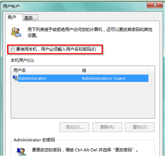 2、在打开的用户帐号窗口中,将“要使用本机,用户必须输入用户名和密码”的勾选去掉,点击“应用”。