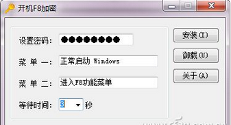 第1步:“开机F8加密器”是款绿色软件,直接运行即可。在主界面中,先清除预设密码,再自行设定一个密码。之后设置开机显示的Windows启动菜单,需要有F8功能菜单项。最后设置启动菜单的等待时间。