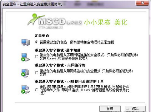 第1步:运行“安全模式进入器”,看到有几个选项,如下图,如果要杀毒,请选择“重启进入安全模式-最少加载项”。如果要进入安全模式并让朋友远程协助以帮你解决问题,那就选择“带网络连接”。