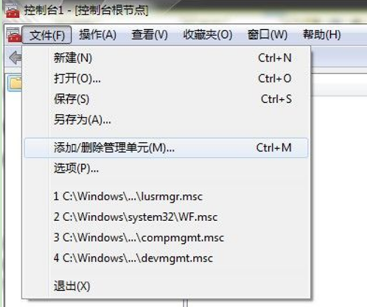 2、在打开的“控制台”窗口中,点击“文件”->"添加/删除管理单元"。