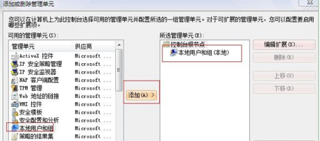 3、在打开的“添加/删除管理单元”窗口中点击“添加”按钮,在“添加独立单元”窗口中选择“本地用户和组”,并点击“完成”。