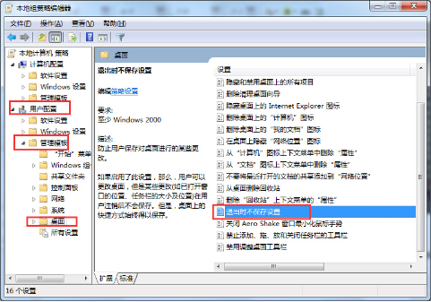 2、在打开的组策略编辑器窗口中,依次展开“用户配置”―“管理模板”―“桌面”选项,在右侧窗口找到并双击“退出不保存设置”选项。