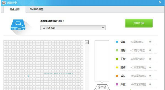 3、打开鲁大师硬盘检测面,点击“开始扫描”,之后鲁大师就会开始扫描电脑硬盘,检测是否有故障或者一些磁盘错误。