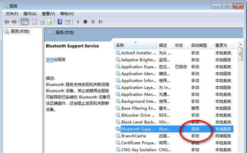 3、在弹出的“Bluetooth Support Service”服务设置窗口中,将启动类型设置为自动,并将启动改为服务,蓝牙功能开启了。