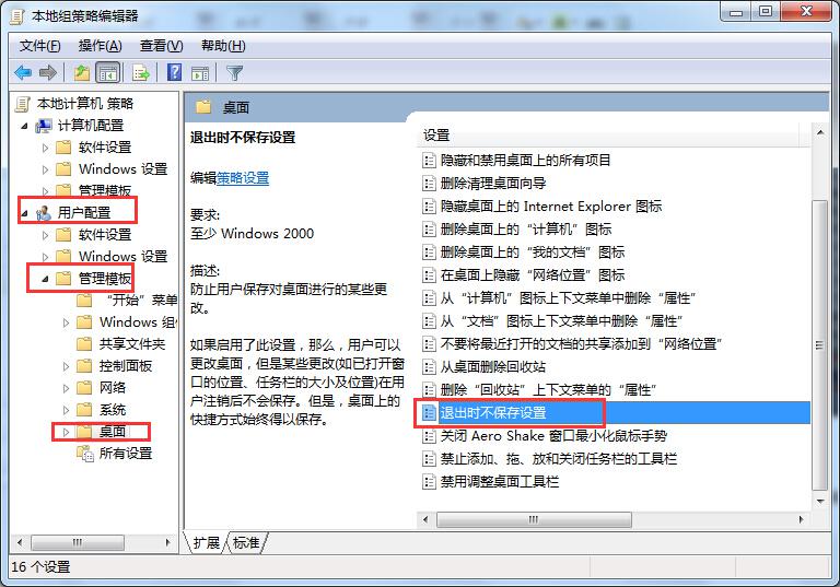 2、在打开的组策略编辑器窗口中,依次展开“用户配置”―“管理模板”―“桌面”选项,在右侧窗口找到并双击“退出不保存设置”选项。