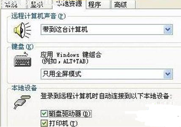 2、在打开的远程桌面连接程序窗口中,单击该界面中的“选项”按钮,并在其后弹出的选项设置窗口中,切换到“本地资源”标签,在“磁盘驱动器”项目前面打勾,再单击“连接”按钮,开始进行远程桌面连接。