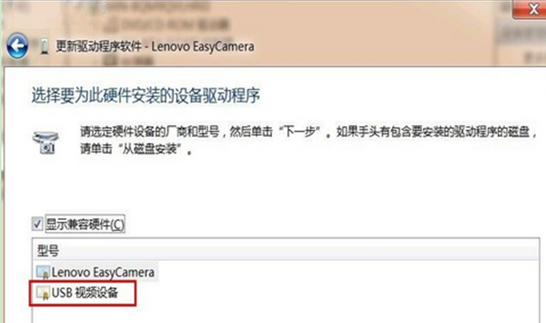 5、弹出选择为此硬件安装的设备驱动程序中,型号处选择“usb视频设备”驱动更新。