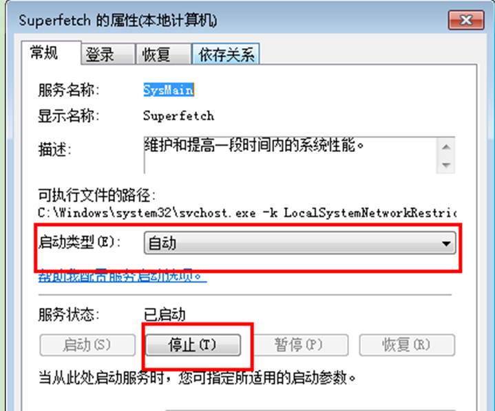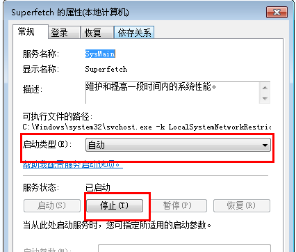 4、在打开的Superfetch服务窗口中,将“启动类型”改成“已禁用”,最后点击“停止”按钮,再点击“应用”——“确定”按钮保存即可。