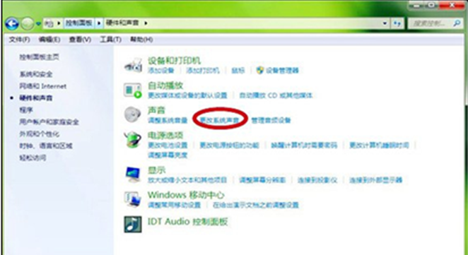 2、在弹出的硬件和声音窗口中,点击“声音”下面的“更改系统声音”。