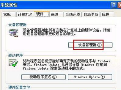 5、在打开的“系统属性”窗口中,切换到“硬件”标签,单击“设备管理器”按钮;