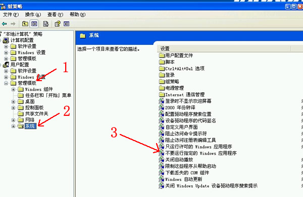 2、在打开的组策略中依次点击“用户配置——管理模板——系统”,在右侧窗口中找到并双击“不要运行指定的Windows应用程序”。