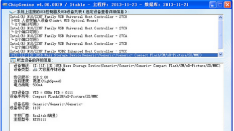 2、 chip genius会自动识别电脑所加载的usb控制器和设备,如图片上半部分,下半部是具体的usb设备信息。