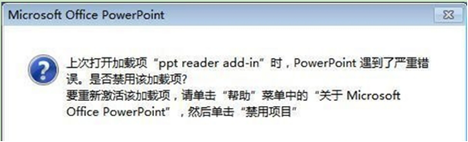1、重启你的Win7计算机,再次打开PowerPoint 2003,此时系统就会弹出:“上次打开加载项“ppt reader add-in”时,PowerPoint遇到了严重错误”的错误提示,如下图示。