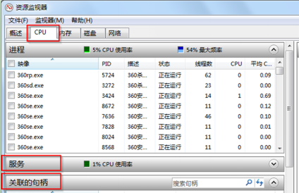 3、在“进程”列表中勾选某个需要查看的进程,在“服务”项中便可看到与该进程相关联的所有服务项目,在下面的“关联句柄”项目中便可看到和该程序关联的所有进程信息。这样就便于揪出隐藏在进程中的木马。