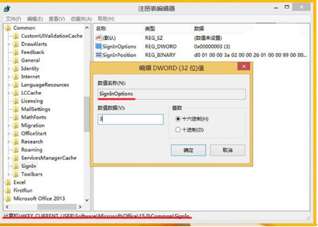 2、注册表编辑器中依次定位至HKEY_CURRENT_USER\Software\Microsoft\Office\15.0\Common\SignIn,在右侧新建一项DWORD(32位)值,重命名为SignInOptions